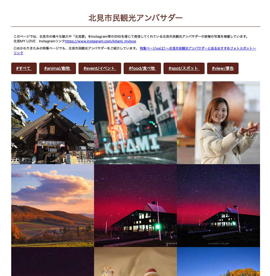 日々、北見市の四季折々の魅力をInstagramで発信していただいている「北見市民観光アンバサダー」の皆様が撮影した写真をまとめた特設ページ「北見市民観光アンバサダーフォトライブラリー」ページができました!